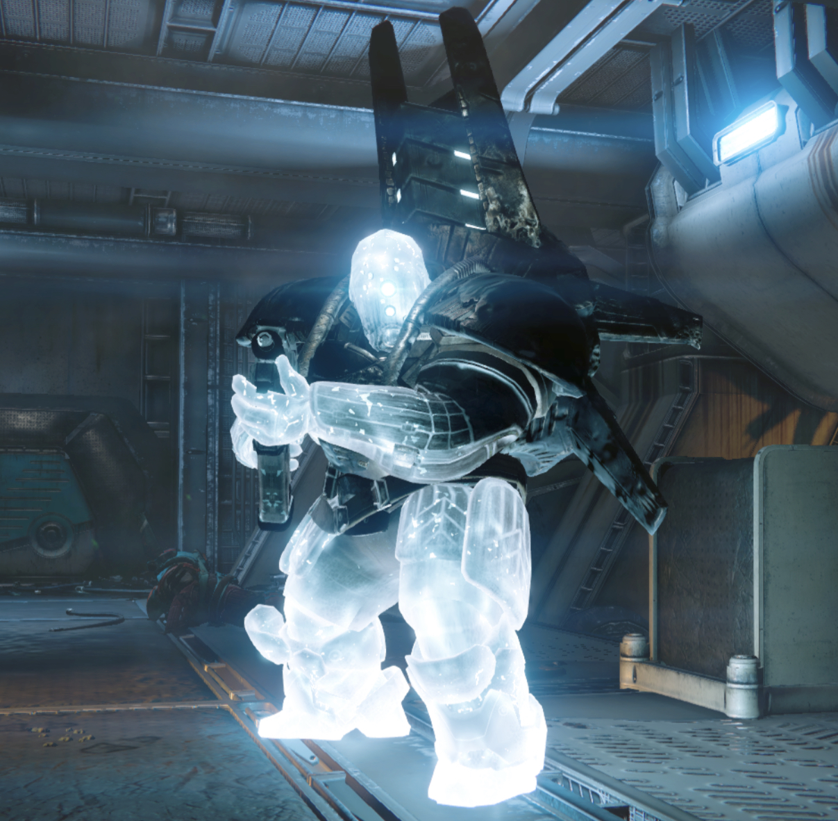 This image is a screenshot of a character or AI unit from the Destiny series of first-person shooter video games developed by Bungie Studios and published by Bungie or Activision. It falls under the screenshot category for a copyrighted computer game or video game, and the copyright for it is most likely held by the company that developed the game. It is believed that the use of a limited number of web-resolution screenshots: