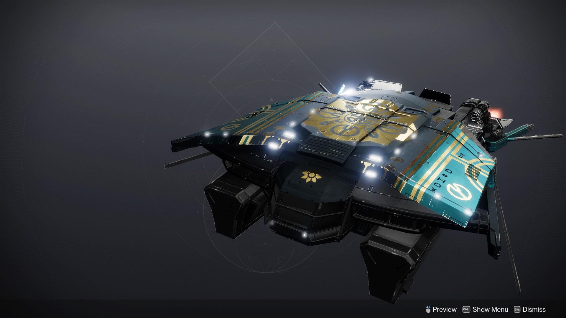 This image is a screenshot of a vehicle from the Destiny series of first-person shooter video games developed by Bungie Studios and published by Bungie or Activision. It falls under the screenshot category for a copyrighted computer game or video game, and the copyright for it is most likely held by the company that developed the game. It is believed that the use of a limited number of web-resolution screenshots: