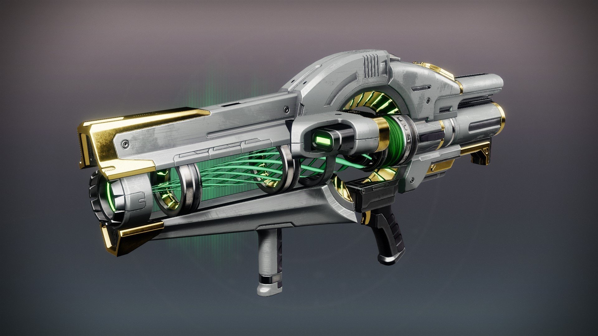 This image is a screenshot of a weapon from the Destiny series of first-person shooter video games developed by Bungie Studios and published by Bungie or Activision. It falls under the screenshot category for a copyrighted computer game or video game, and the copyright for it is most likely held by the company that developed the game. It is believed that the use of a limited number of web-resolution screenshots: