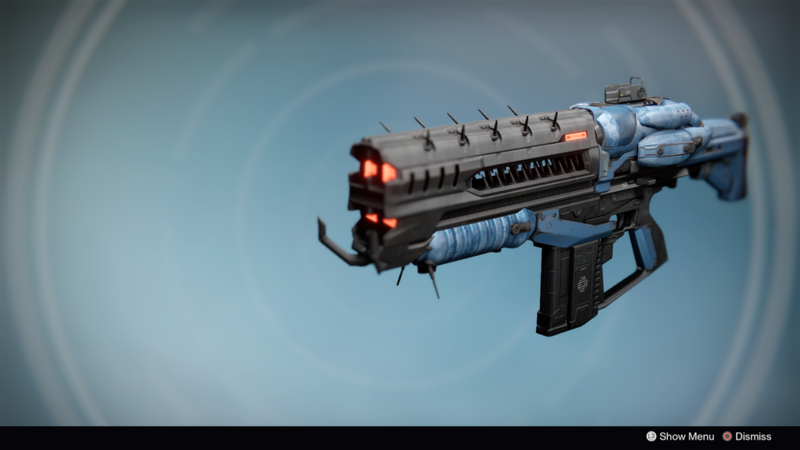 This image is a screenshot of a weapon from the Destiny series of first-person shooter video games developed by Bungie Studios and published by Bungie or Activision. It falls under the screenshot category for a copyrighted computer game or video game, and the copyright for it is most likely held by the company that developed the game. It is believed that the use of a limited number of web-resolution screenshots: