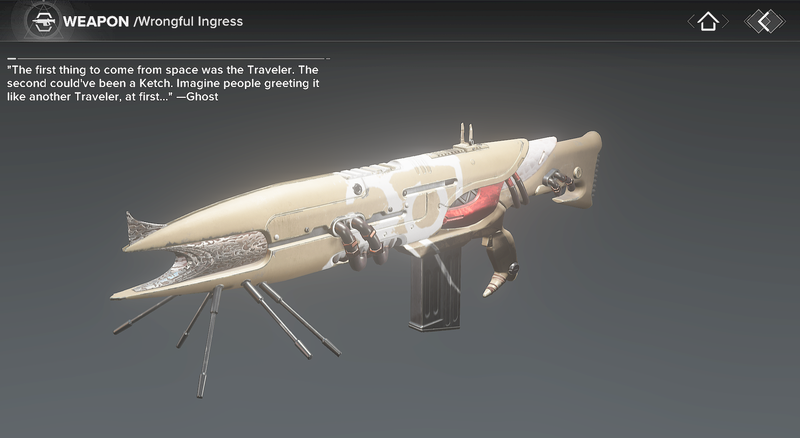 This image is a screenshot of a weapon from the Destiny series of first-person shooter video games developed by Bungie Studios and published by Bungie or Activision. It falls under the screenshot category for a copyrighted computer game or video game, and the copyright for it is most likely held by the company that developed the game. It is believed that the use of a limited number of web-resolution screenshots: