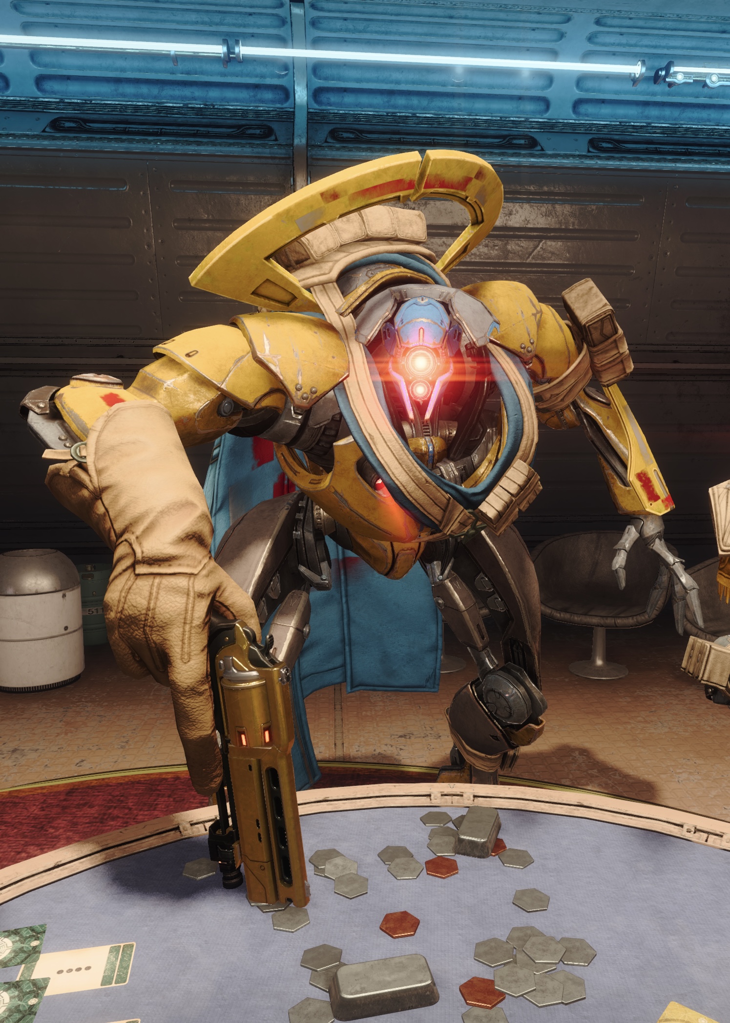 This image is a screenshot of a character or AI unit from the Destiny series of first-person shooter video games developed by Bungie Studios and published by Bungie or Activision. It falls under the screenshot category for a copyrighted computer game or video game, and the copyright for it is most likely held by the company that developed the game. It is believed that the use of a limited number of web-resolution screenshots: